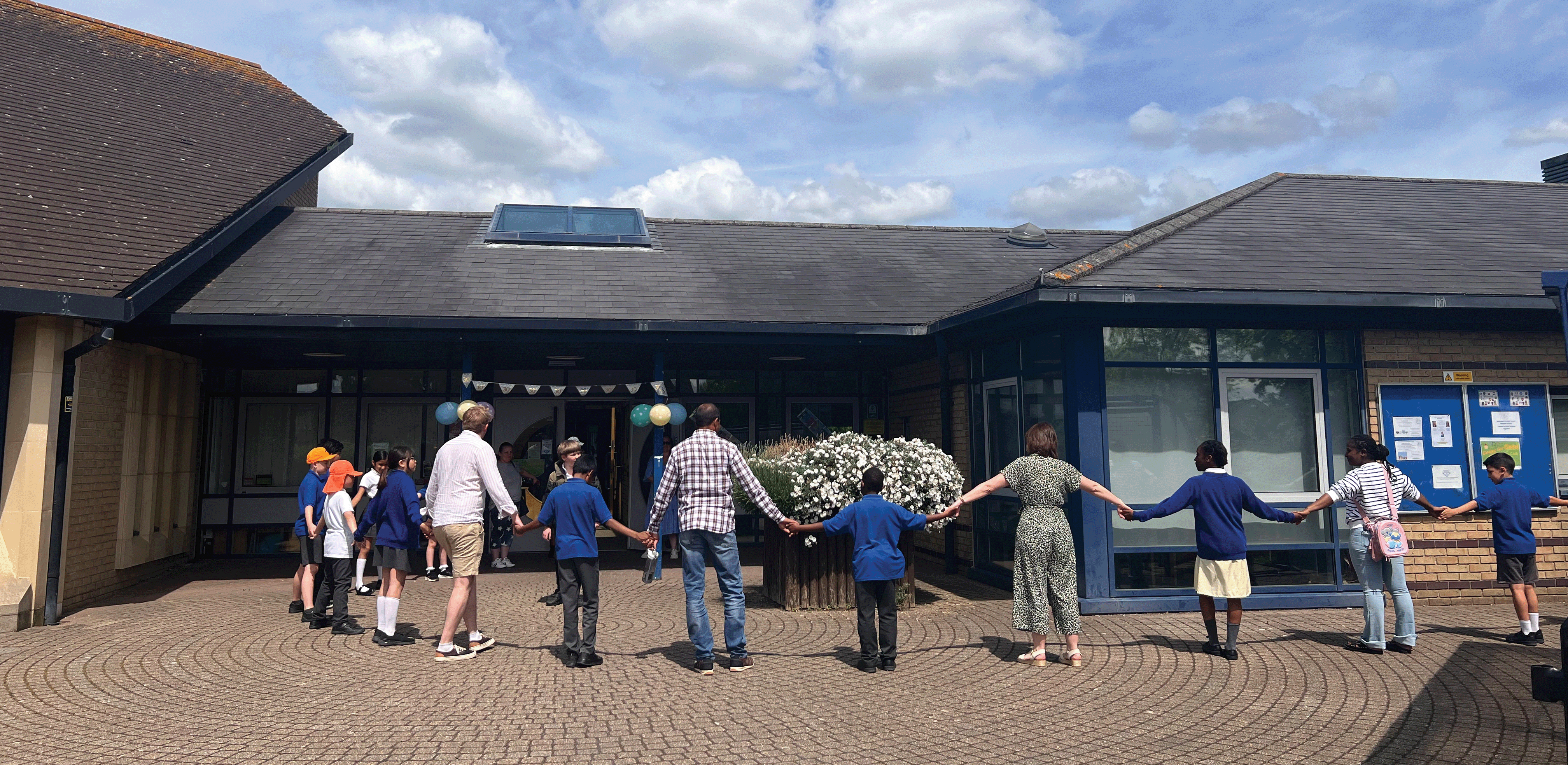30 years later the sun was shining for the whole school picnic on the lovely playing field. This was followed by the traditional ‘clypping’ (main photo) whereby the whole school, children and teachers, held hands in an inward facing circle to surround the entire school building symbolising a ‘hug’ that embraces the school and everyone in it.