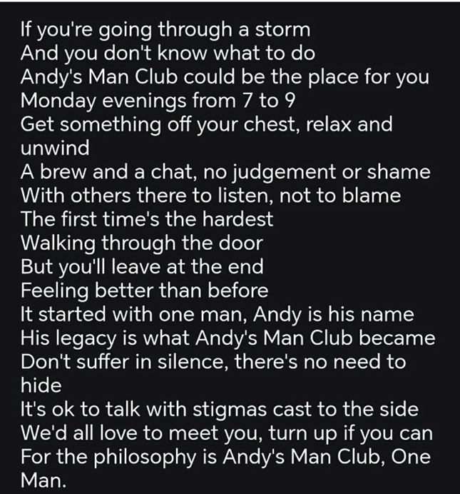 Bradley Stoke & Little Stoke Gifford Matters was delighted to hear from one of the local Andy’s Man Clubs, of a poem written by one member following his experience and wanting to encourage others to understand what the club is all about. We are so pleased to share it here with our readers.