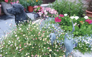 Although the lock down prevented us from meeting as a group, I did manage to have a pair of secateurs or a trowel in my pocket on our allowed daily walk and do a few bits and pieces, and again at Easter and VE Day we appeared through the early morning mist to decorate our planters and the Manor Farm roundabout. Although Treacle the Manor Farm roundabout dog has gone missing, Debbie the heifer, complete with quarantine tape, made a very welcome return. The