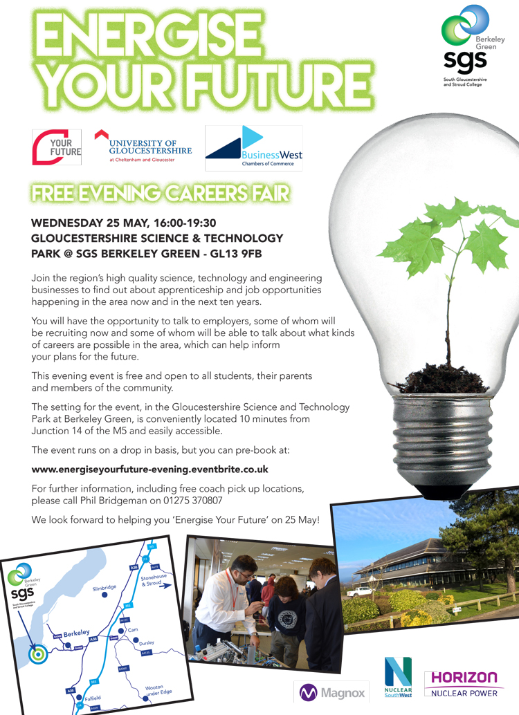 Entitled ‘Energise Your Future’, the event is the result of a partnership between Business West, South Gloucestershire and Stroud College, the University of Gloucestershire, Magnox and Horizon. Parents are also being invited to the day at the developing Gloucestershire Science and Technology Park, situated on the site of the former Berkeley Nuclear Laboratories on the banks of the River Severn. Over 30 companies will be showcasing the job opportunities they have to offer the STEM students. The day will run into the evening (4 – 7pm) so parents and older students can talk to the companies about apprenticeships and job opportunities.
