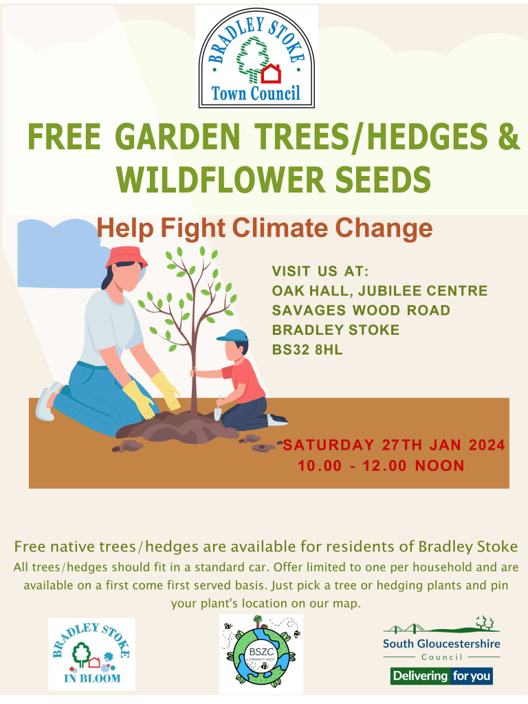 Free trees/hedges/wildflower seeds event taking place on Saturday 27th January 2024 in the Oak Hall, Jubilee Centre, Savages Wood Road, Bradley Stoke, BS32 8HL between 10.00am and 12 noon.