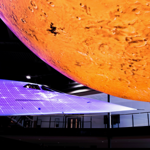 Aerospace Bristol’s Journey to Mars exhibition marks the 20th anniversary of Mars Express, Europe’s first mission to Mars. The exhibition includes models of the Mars Express Orbiter and the Beagle 2 lander on display alongside the Mars sculpture. Measuring seven metres in diameter, Mars features detailed NASA imagery of the Martian surface. At an approximate scale of 1:1 million, each centimetre of the internally lit spherical sculpture represents 10 kilometres of the surface of Mars.