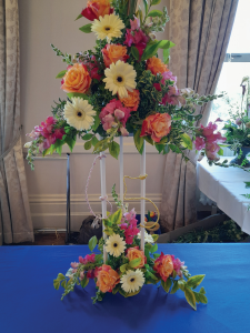 Sally’s first presentation was an unconventional arrangement in the style which Constance Spry would have used in the 20th century. Fresh foliage, Jasmine, Pink Dahlias purple Cala Lilies together with Roses, were displayed in a large metal container. To compliment this display, a smaller arrangement, which was arranged in a Paella dish, was placed alongside. Sally explained that in those days any container would have been used, such as a Frys Benson pie tin. Her next arrangement was a small triangle containing pink Antirrhinums, Roses and yellow Gerberas. The arrangement was placed on top of a stand with a smaller arrangement with the same flowers placed underneath. Between both arrangements attached was the number sixty-five made from covered wire . Very appropriate for our anniversary.
