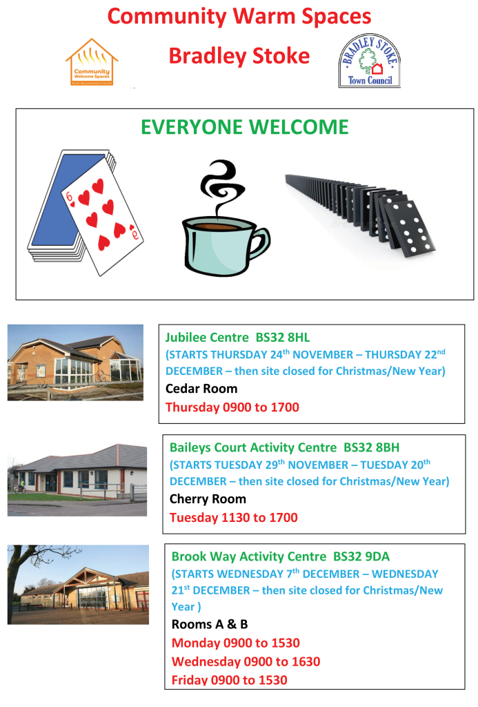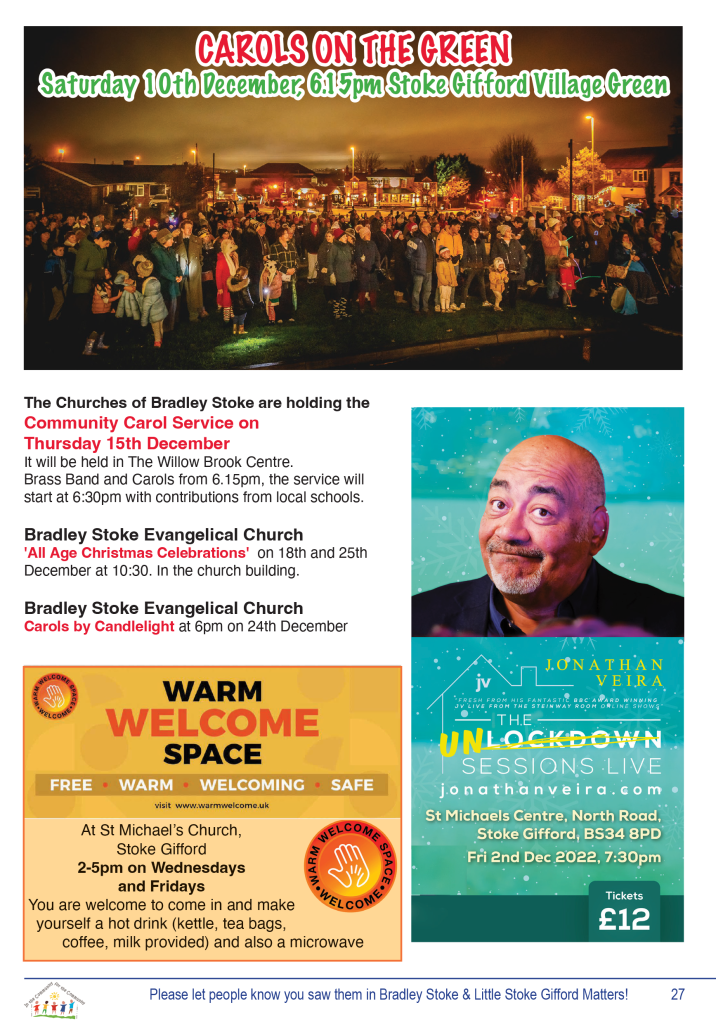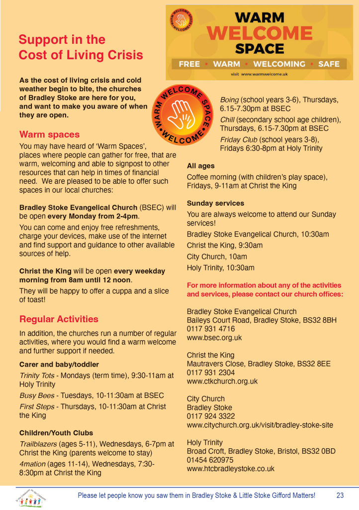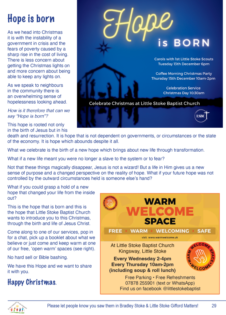 December 6th, 2022With temperatures set to plummet this week, just a reminder that there are ‘Warm Places’ set up across the Stokes by the local Churches and the Town Council that you are welcome to drop into and rest a while, have a chat, enjoy a warm drink, some company and even a light meal in some instances. Attached are pages from our December magazine giving more information of times and days available in different venues, along with the Town Council’s poster information.